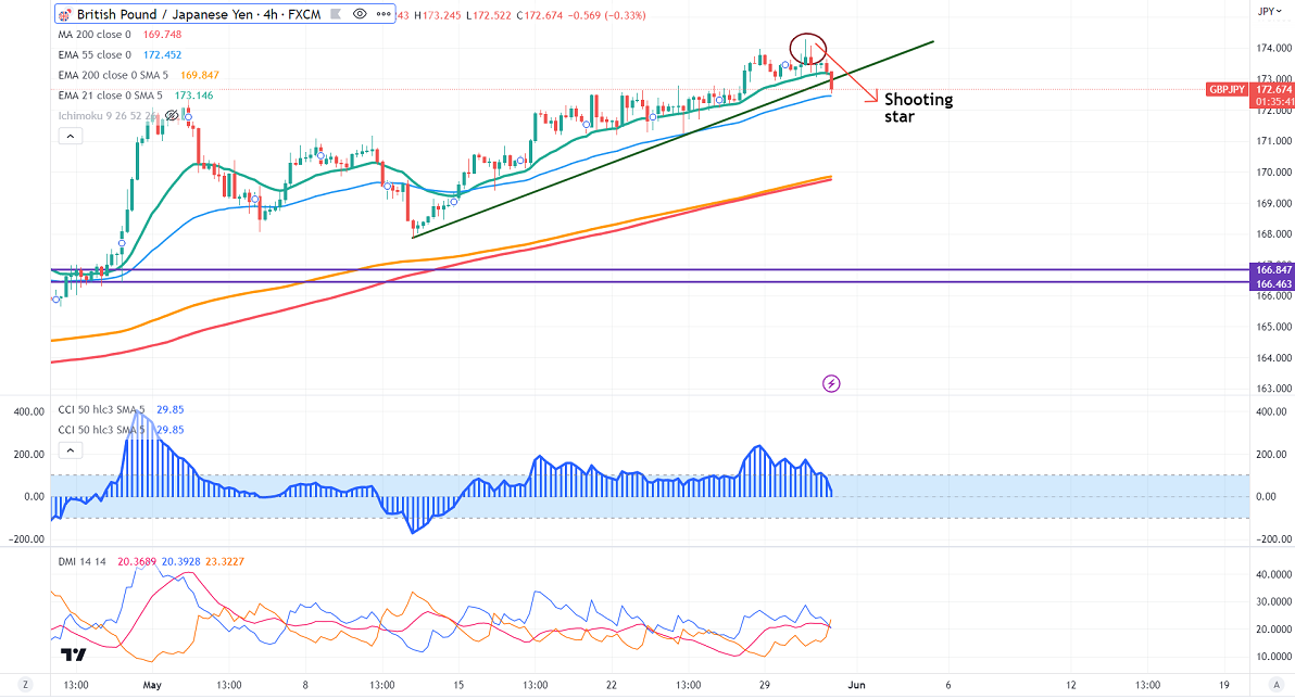 GBPJPY pared some of its gains on the weak Pound sterling. It hit an intraday low of 172.61 and is currently trading around 172.728.