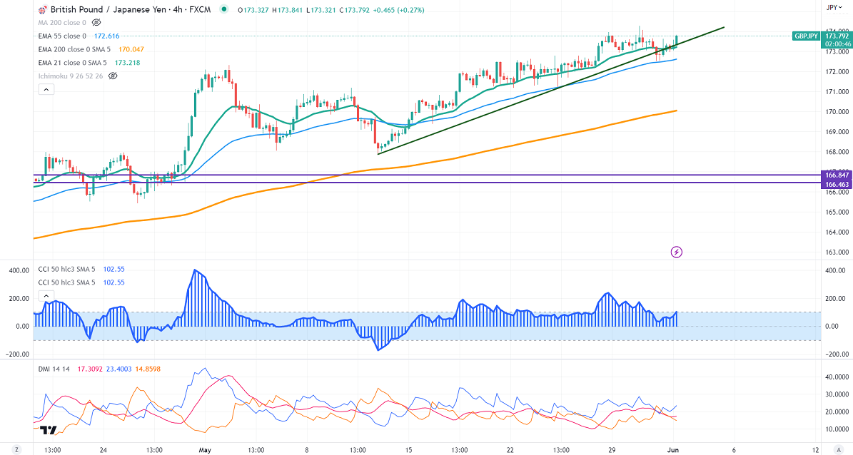 GBPJPY recovered above 173.50 on strong Pound sterling. It hit an intraday high of 173.73 and is currently trading around 173.725.