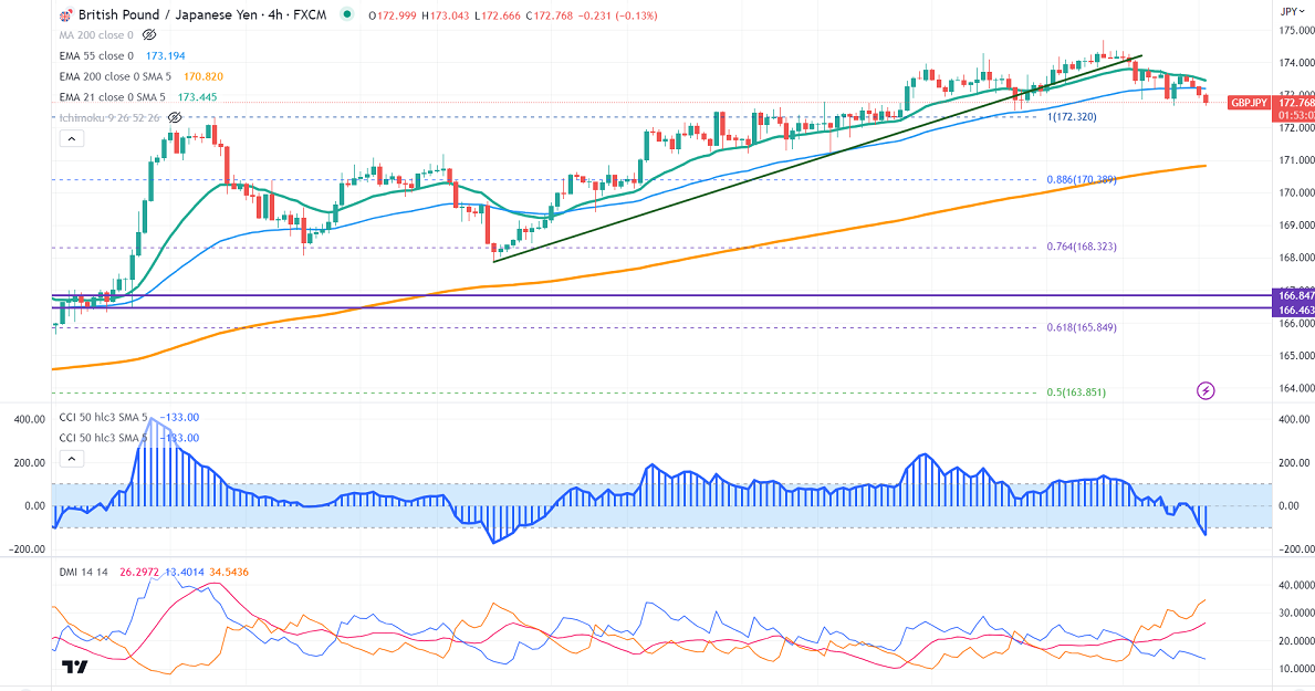 GBPJPY traded weak for the third consecutive day and lost more than 200 pips from a minor top of 174.68 on the weak pound sterling. It hits a low of 172.67 and is currently trading around 172.85.