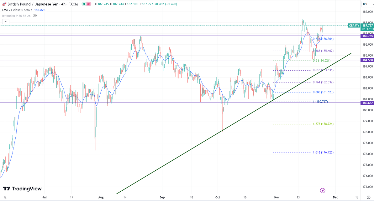 The near-term resistance is around 188.25, a breach above targets 189.20/190. The immediate support is at 187, any violation below will drag the pair to 186.50/185.40