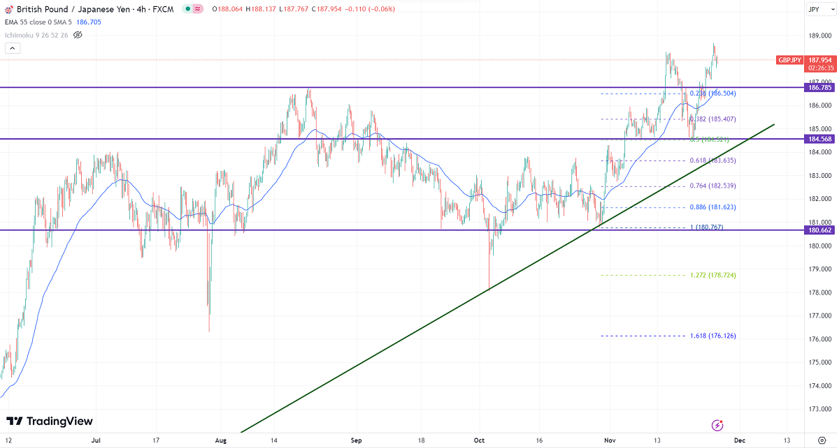 GBPJPY trades higher for the fourth consecutive day on strong pound sterling. It hit a high of 187.65 yesterday and is currently trading at around 187.95