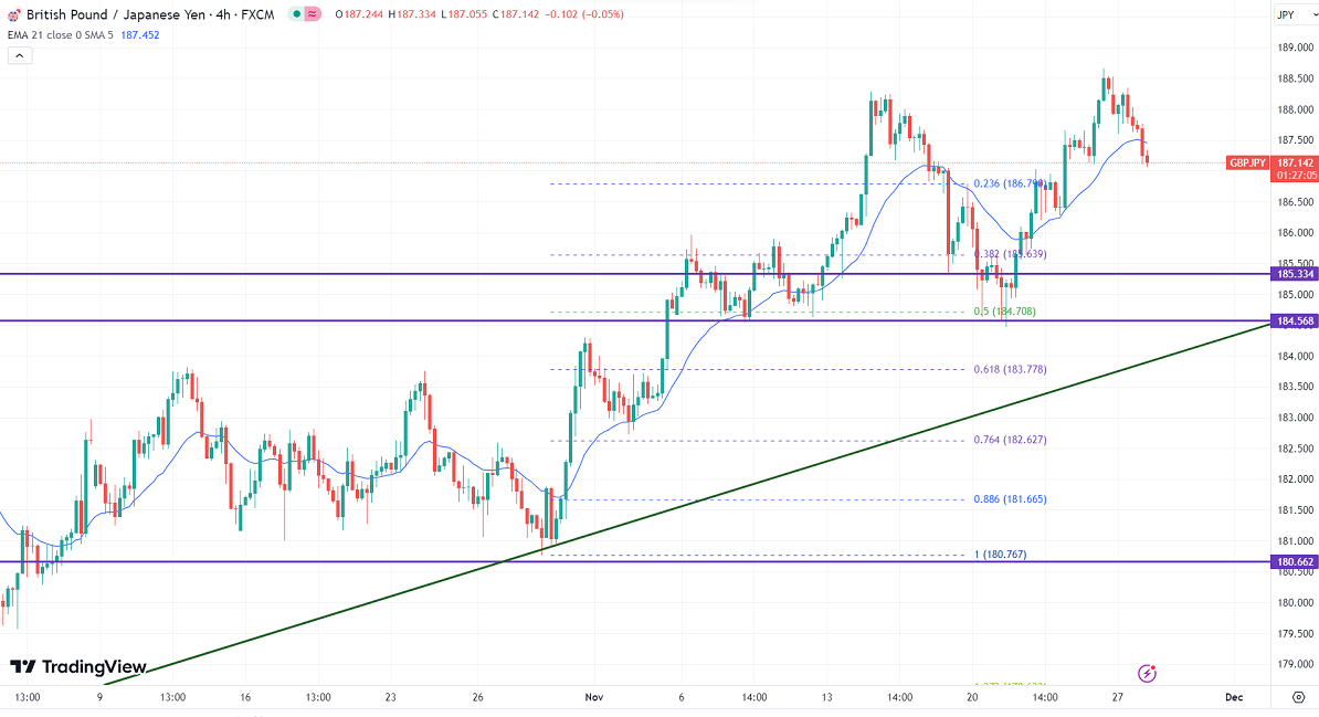 GBPJPY showed a minor sell-off on the strong yen. It hit a low of 187.05 at the time of writing and is currently trading at around 187.17.