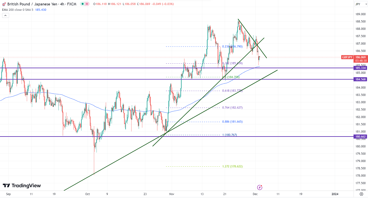 GBPJPY showed a minor pullback after hitting a multi week low on strong yen. It hit a low of 185.51 at the time of writing and is currently trading at around 186.10.