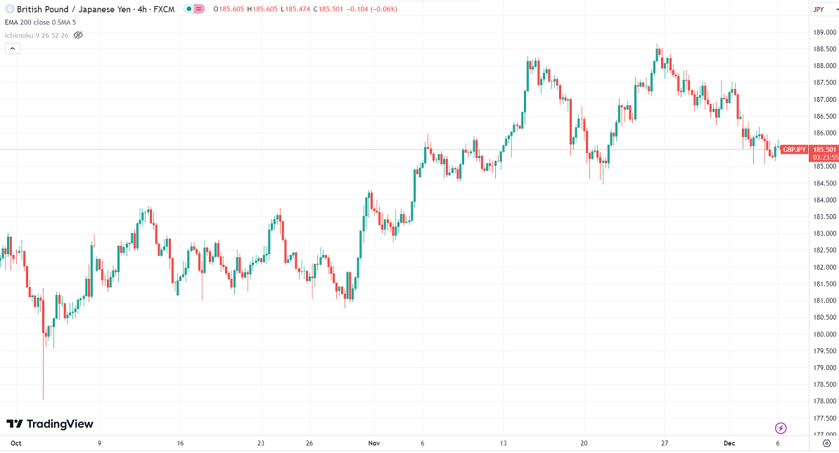 GBPJPY trades in a narrow range between 186.18 and 185.06 for the past two days. It hit a low of 185.14 yesterday and is currently trading at around 185.238.