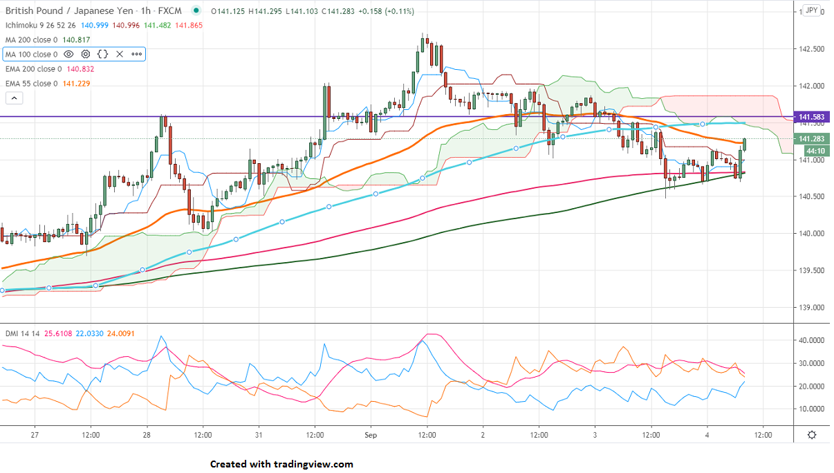 On the hourly chart, the pair surged sharply after a minor dip below 200 – MA. Any close below 140 .80 will drag the pair down till 140/139.66/138.41. It is facing strong resistance at 143.15, any violation above that level targets 144.80/146.