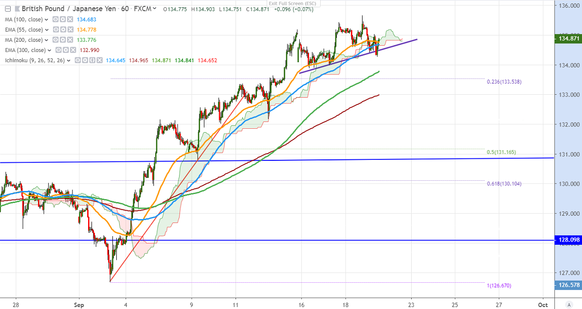 GBPJPY has halted its 2- weeks of winning streak and showing a minor weakness. The pair jumped more than 900 pips on account of the strong Pound sterling. The yen also trading slightly weak on easing the US-China trade war. It hits a high of 135.66 and is currently trading around 134.43.