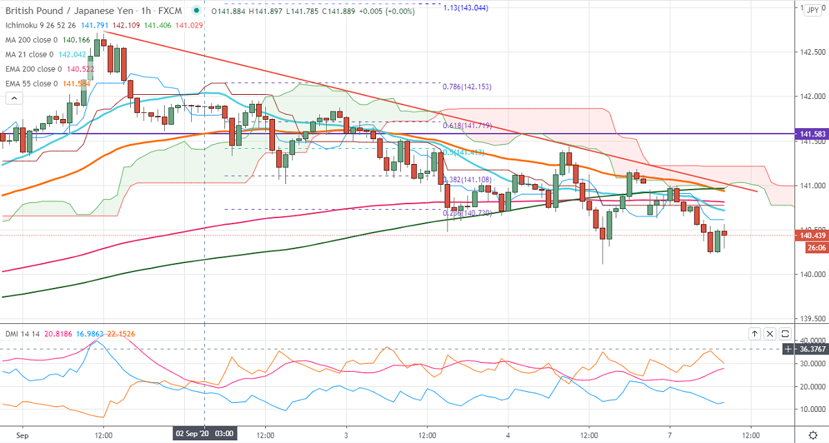 On the hourly chart, the pair holding well below 100 and 200 MA. Any close below 140 will drag the pair down till 139.66/138.25. It is facing strong resistance at 141.45, any violation above that level targets 141.75/142/142.71.