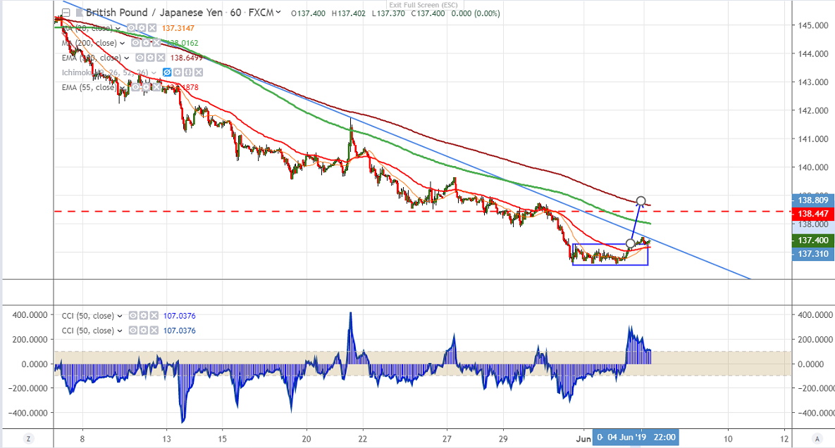 As per our yesterday analysis GBPJPY has shown a minor jump till 137.53 after breaking 137.29 high made on May 31st. The pair has formed a temporary bottom near 136.50 and it has halted its past 10 days weak trend.The weakness was mainly due to selling in GBP due to Brexit uncertainty. It is currently trading around 137.40.