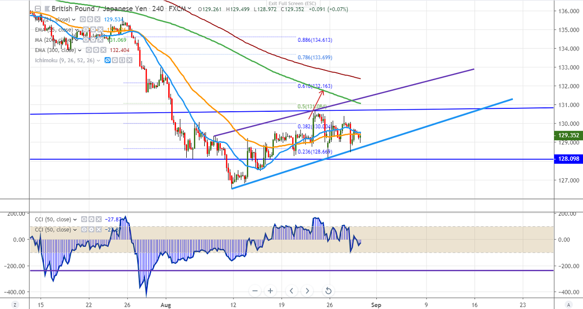 The pair is consolidating in a narrow range inside channel for the past 2weeks. It has formed a temporary top around 130.69 on Aug 22nd, 2019 and shown a more than 200 pips decline on strong yen. The yen was trading slightly strong on trade escalation between US-China. GBPJPY hits low of 128.47 and are currently trading around 128.47 yesterday and are currently trading around 129.25.