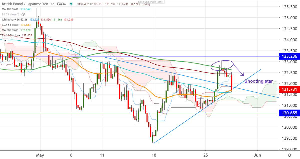 GBPJPY formed almost a double top around 133 and lost more than 150 pips on the weak Pound sterling. GBP has lost more than 150 pips against USD after the refusal of extension of Brexit. It hits an intraday low of 131.63 and is currently trading around 131.689.