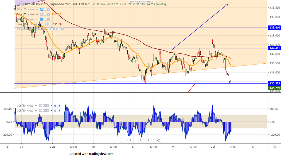 GBPJPY is trading lower for the past 2 trading days and declined more than 250 pips from a high of 147.77. The decline was due to a slight jump in Safe-haven assets like yen and Gold on global growth concern and geopolitical tension. The pair hits 2-week low at 135.18 and is currently trading around 135.25.