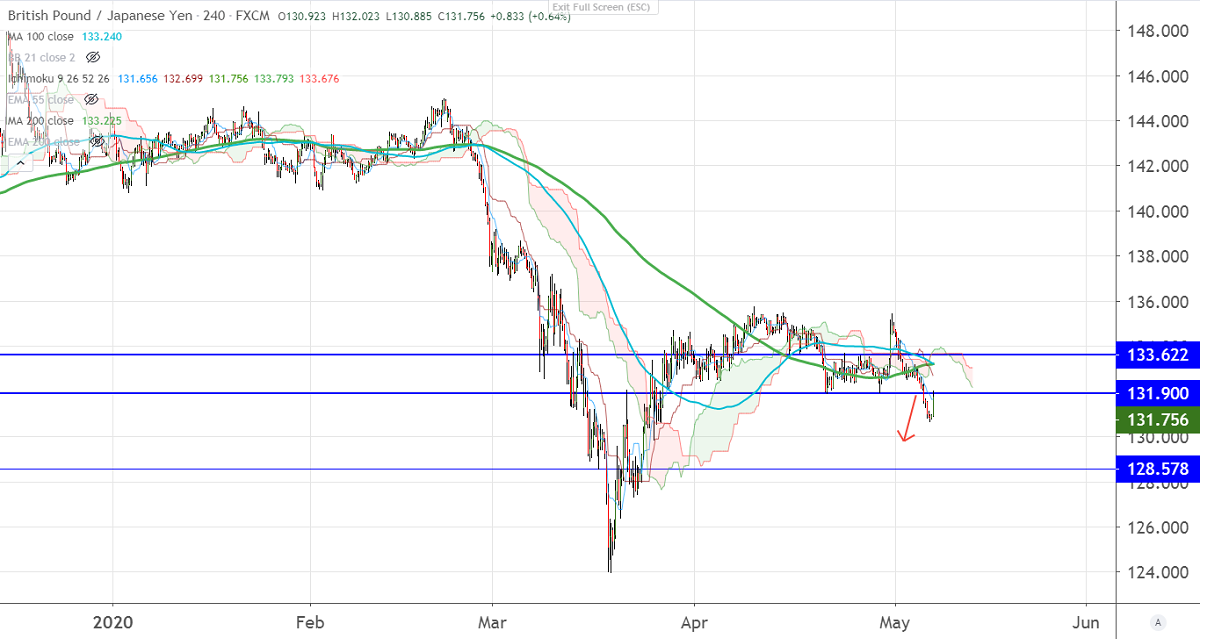 GBPJPY is trading lower for 2nd consecutive days on Pound sterling weakness. The pair has formed a minor top 135.45 on Apr 30th, 2020, and started to decline. It has broken significant support 131.90 yesterday and hits a low of 130.66 levels. It is currently trading around 131.05.