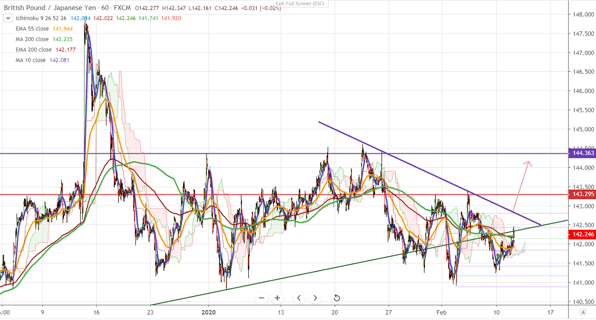 GBPJPY has formed a minor bottom around 141.24 and shown a jump of more than 100 pips on the strong Pound sterling. GBP was trading higher against USD and shown recovery from low of 1.28721 till 1.29680.