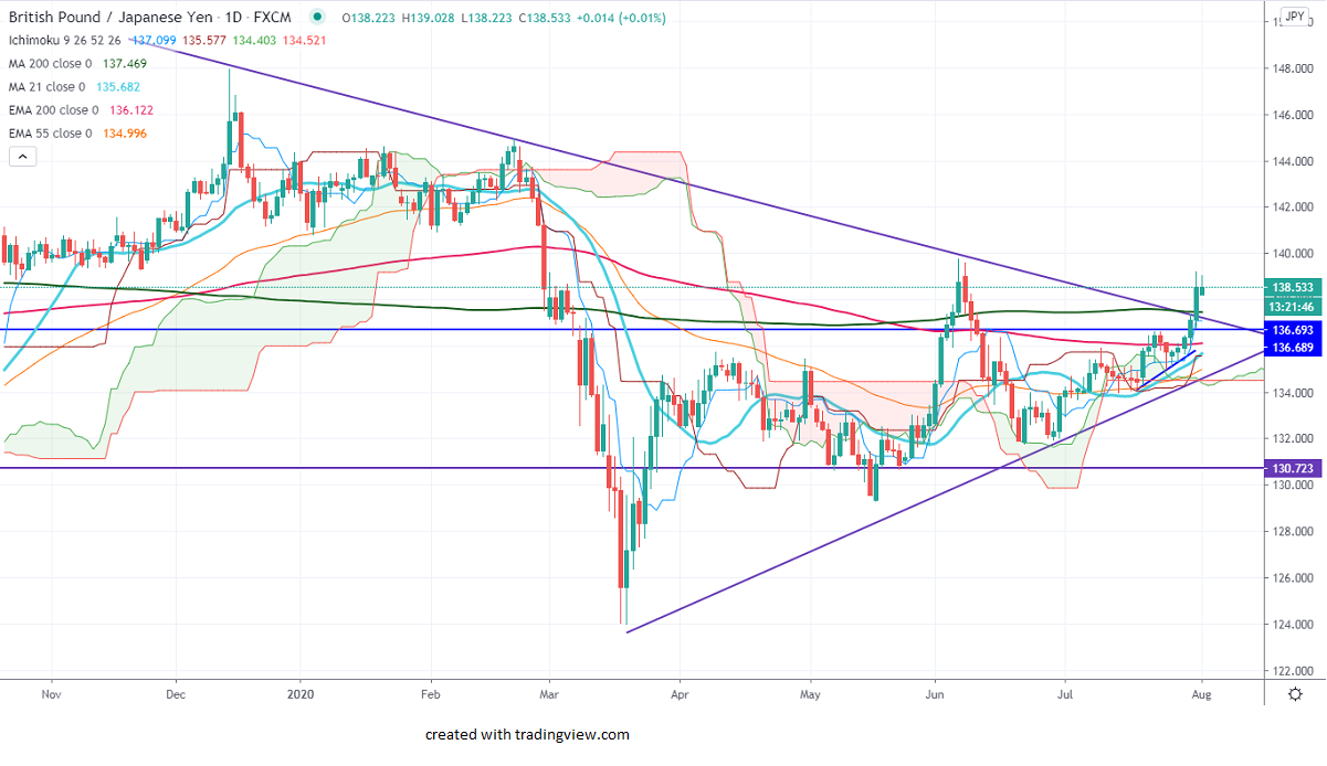 GBPJPY is consolidating after hitting a high of 139.20 yesterday. The pair is upside is capped due to weak Pound sterling. GBPUSD lost more than 100 pips on London lockdown due to coronavirus and US and UK deal. USDJPY jumped 120 pips from a low of 104.23. Any major trend reversal only if it closes above 106.