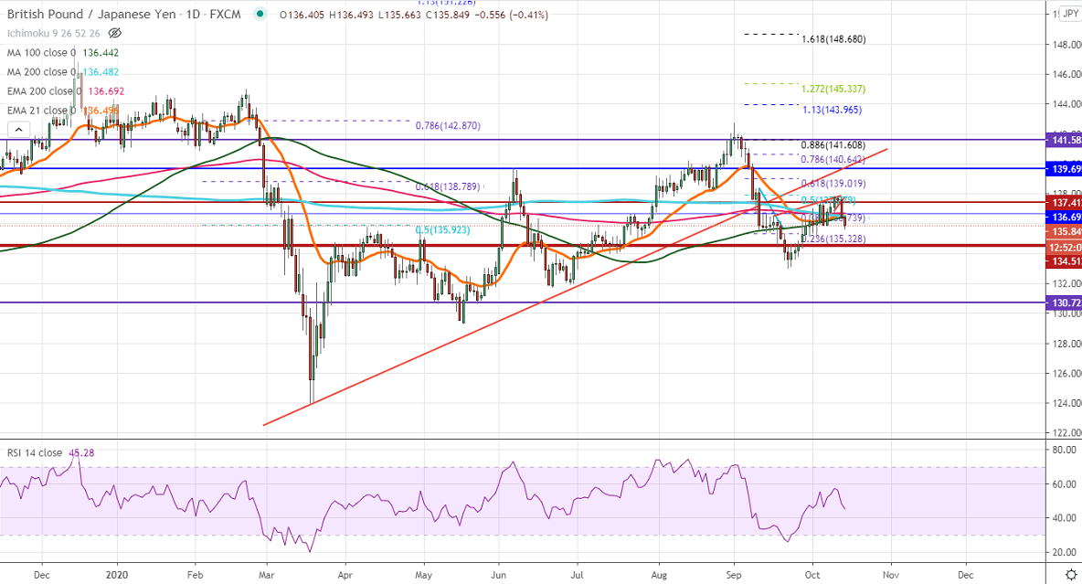 The pair has closed below 21- day EMA and this confirms trend reversal, A dip till 135/134.36 is possible. The near term resistance is around 136.90, any indicative surge past that level confirms minor bullishness. A jump till 137.75/138 likely.