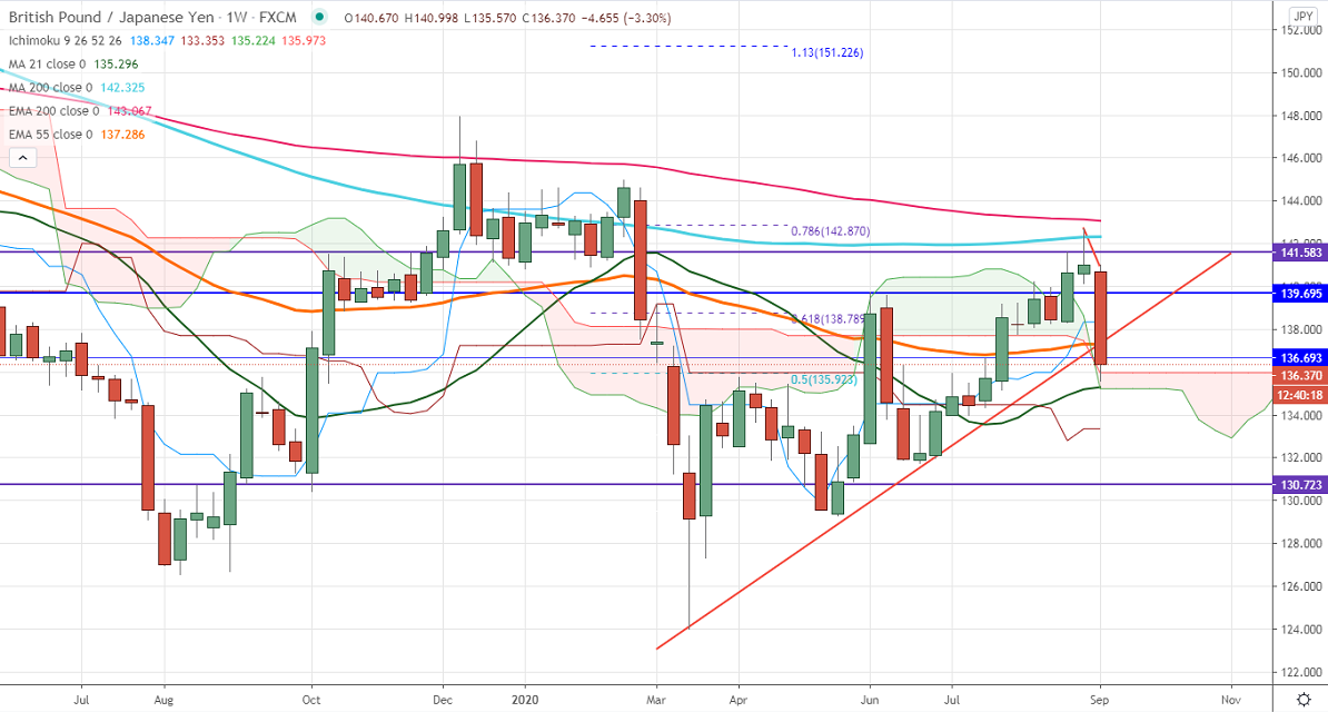 GBPJPY is trading weak for the entire week and lost more than 500 pips on the weak Pound sterling. GBP declined more than 250 pips in the past two days on Brexit uncertainty. The UK GDP came at 6.6% July slightly lower than expected. The intraday trend of the Pound/Yen is bearish as long as resistance 138 holds.