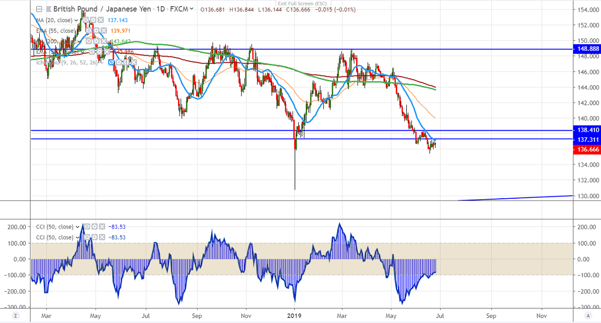 GBPJPY is consolidating in the narrow range between 137.179 and 135.94 in the past four days. Yesterday it was showing minor weakness till 136.14 and shown a recovery. The jump was mainly due to strength in Pound sterling despite no deal Brexit. GBPUSD advances higher and it is facing strong resistance around 1.2800 (55- day EMA). The escalation of US-Iran tension is supporting safe-haven assets like yen, Swiss franc. The pair hits high of 136.84 and is currently trading around 136.56.