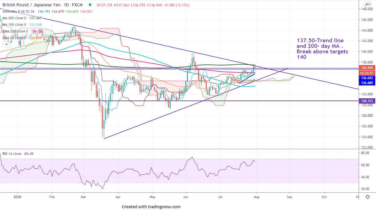 The daily chart shows that pair is trading well above 100- MA (133.50) and any break above 137.50 (200 MA) confirms trend continuation. A jump till 138.50/140.