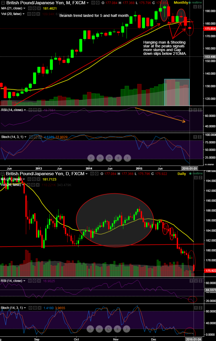 On daily chart, we have no deviation from this bearish view. After last week's "back to back Doji" pattern candles to end the year 2015 at around 178.487 and 178.480 levels, now the pair is again arrived with a serious gap down opening.