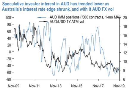 From a financial market standpoint, the 400 bp of RBA rate cuts alongside the secular slowdown in Australian growth this decade have resulted in a U-turn in investor interest in AUD; IMM positions have trended one way lower since the GFC and have now turned substantially short as the zero lower bound has come into sight (refer 1st chart). This has proven severely punitive for FX volatility – 1Y ATM vols have compressed 50% from their pre-RBA cycle norms – as the absence of healthy rate differentials and spec length has sharply dampened, if not entirely eliminated the boom- bust cycles of carry-related re- and de-leveraging that gave AUD vols their erstwhile potency.