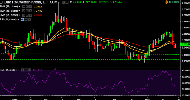 We prefer to take long position in EUR/SEK around 9.2565, stop loss 9.24 and target of 9.2928 marks.