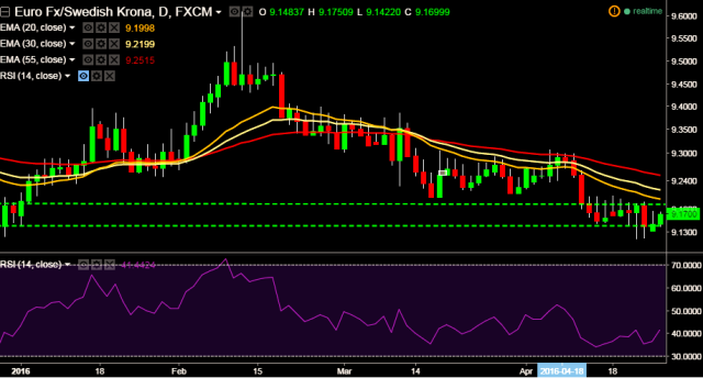 We prefer to take short position in EUR/SEK at 9.17, stop loss 9.1760 and target 9.1435 marks.