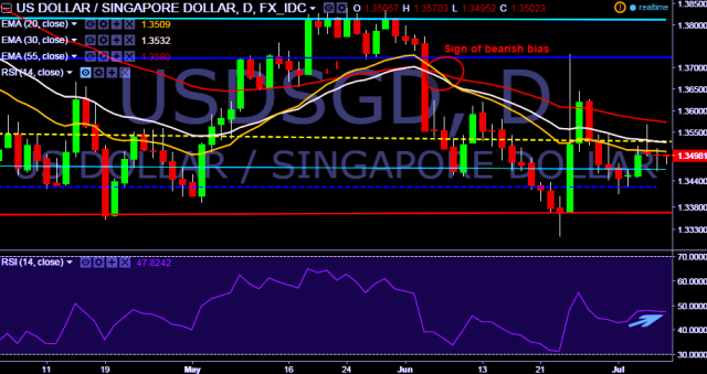We prefer to take short position in USD/SGD around 1.3500, stop loss 1.3570 and target 1.3410 marks.