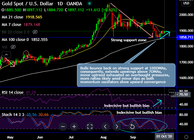 Technically, gold price chart (XAUUSD) shows bounce back at strong support of 100-DMAs, currently, edging above 7-DMAs and trading at $1,897 levels (refer daily chart). Thereby, the current price continues to spike further testing support at 7-DMAs despite recent price dips. Prior to which, as stated before in our recent post, bulls bounce back especially after testing the strong support at $1,445 - $1,455 levels and gold’s exhaustive rallies upon some bearish patterns.