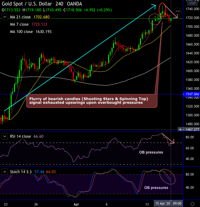 Technically, XAUUSD (Gold) price chart forms back-to-back shooting star and gravestone doji at peaks of rallies. These bearish pattern candles coupled with downward convergence of leading oscillators (RSI & Stochastic curves) signal overbought pressures (refer oval shaped area in the daily chart). Thereby, the minor uptrend has appeared to be exhausted and the current price have slid below 7-DMAs at this juncture.