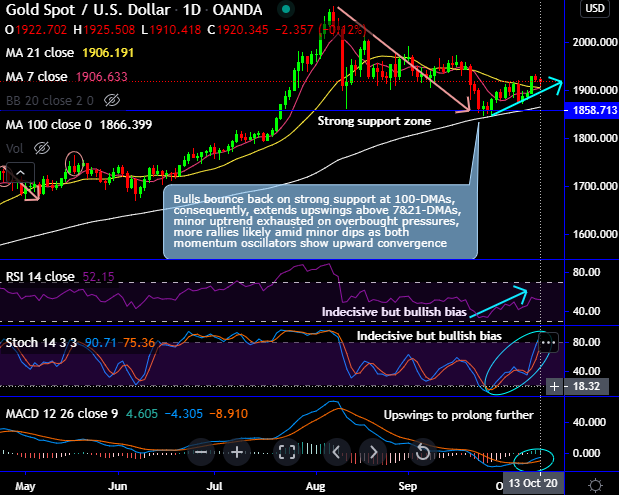 Technically, gold price chart (XAUUSD) shows bounce back at strong support of 100-DMAs, currently, edged above 7-DMAs and trading at $1,904 levels (refer daily chart). Thereby, the current price continues to nudge below 7-DMAs again despite recent price rallies. Prior to which, as stated before in our recent post, bulls bounce back especially after testing the strong support at $1,445 - $1,455 levels and gold’s exhaustive rallies upon some bearish patterns.