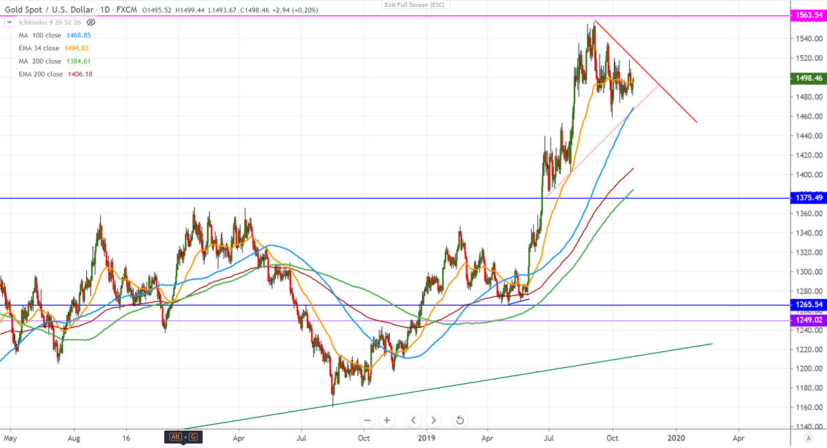 Gold recovered nearly $20 from a low of $1481 after Fed monetary policy meeting. The central bank has cut its rates by 25 bps with 8-2 vote in favor of rate cut. It has changed its forward guidance by removing "act as appropriate" and this shows that the Fed is expected to follow a wait and watch approach. US ADP private employment has added 125000 jobs in the month of Oct vs forecast of 125, real GDP increased at an annual rate of 1.9% slightly less than the second quarter 2%. According to the Fed watch tool, the chance of keeping rates unchanged has increased from 0% to 83%.