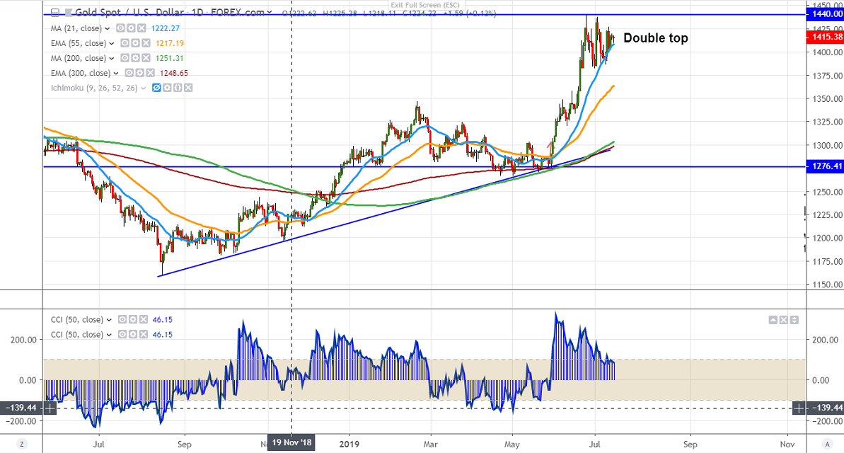 Gold is trading in a narrow range between $1437 and $1385 for the past 5 trading days. The yellow metal formed a triple top ($1440,$1437 and $1427). US 10 year yield trades higher for the 3rd consecutive week and jumped more than 11% from low of 1.93%. According to the CME Fed Watch tool, there is a 74.4% probability of rate cut in Jul and 25.6% chance of rate cut of 50 bpbs.