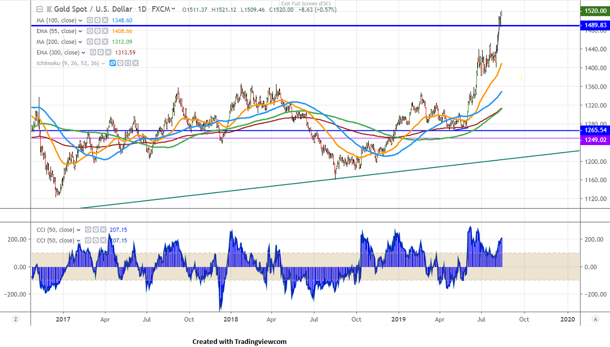 The gold price continues to trade higher and jumped nearly $40. The yellow metal is still in bullish mode due to the increase in the Safe-haven demand on the US-China trade war. US 10 year yield declined more than 7% from the previous week close 1.75%. According to the CME Fed Watch tool, the probability of 25 bps has decreased to 82.3% from 84.6% and the chance of 50 bps jumped to 17.7% from 15.4%. It is currently trading around $1520.