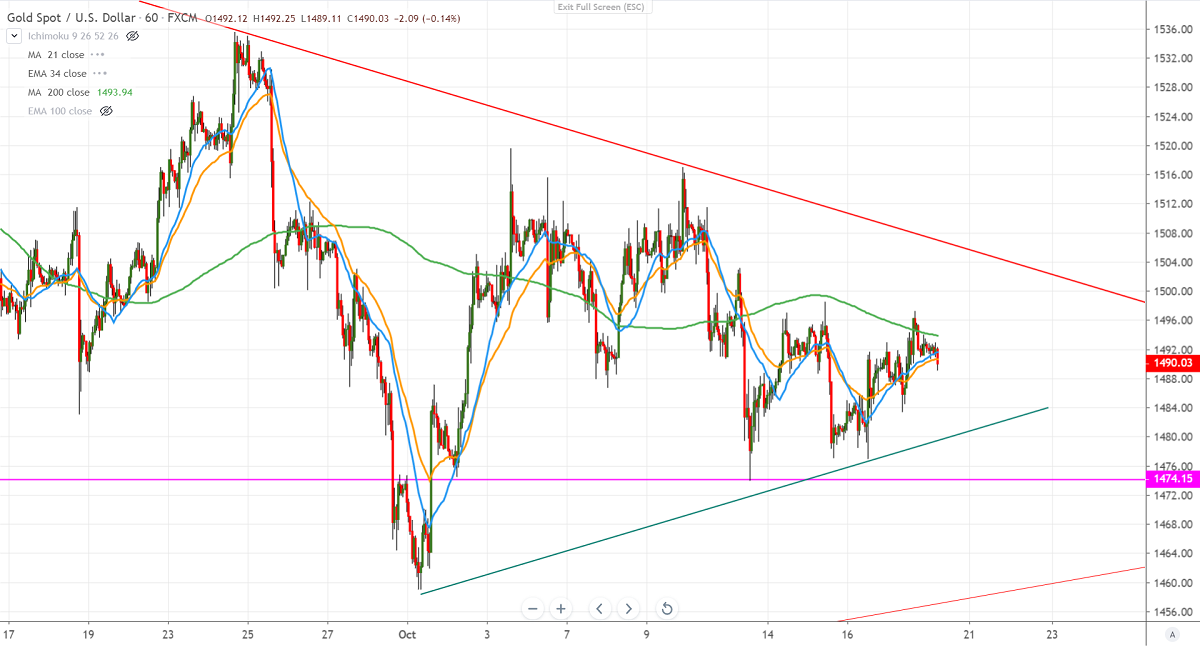 Gold is consolidating after hitting a high of $1493 and is currently trading around $1491.50. The easing geopolitical tension is putting pressure at higher levels. The EU-UK has reached Brexit deal, but EU member states should back this deal. On the economic data front, US Philly fed manufacturing index came at 5.6 compared to a forecast of 7.3. It has increased hopes of a further rate cut by the Fed.