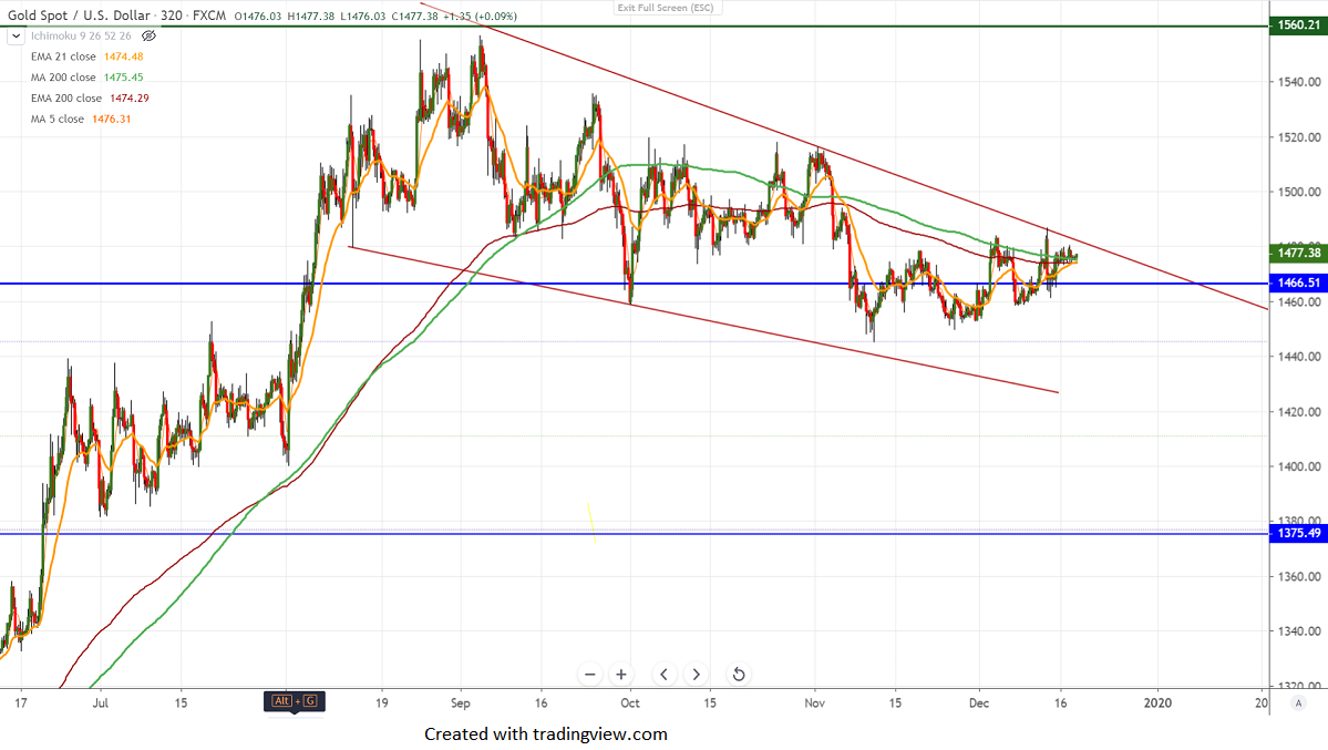 Gold is trading in a narrow range between $1449 and $1486 for the past 3-week. The US and China trade optimism have decreased demand for Safe-haven assets like yen, gold. It hits a high of $1480.47 and is currently trading around $1476.96.