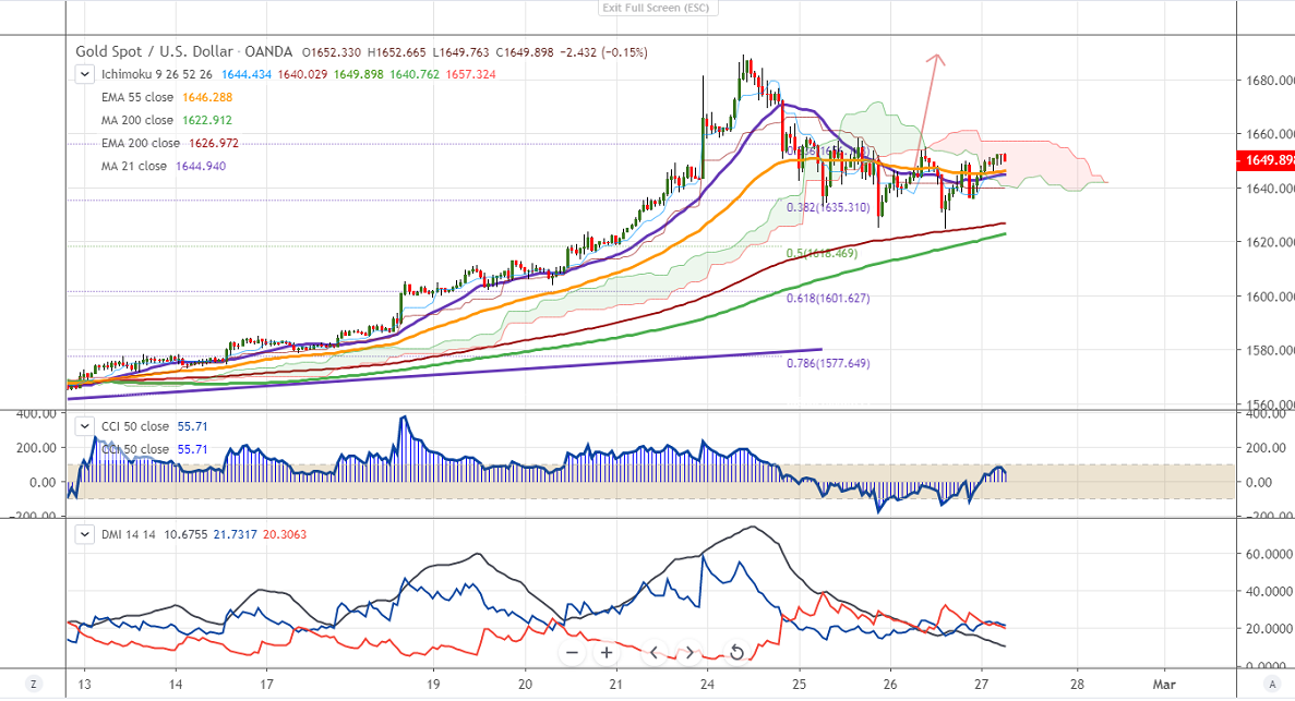 Gold has recovered more than $25 from yesterday's low of $1625. The jump was mainly due to weakness in the global stock market on coronavirus. US markets especially S&P500 lost more than 100 points after minor recovery. China's National Health Commission said that the number of new cases increased by 334 and death by 29. South Korea is one of the most affected next to China and the total number of people died rose to 334.