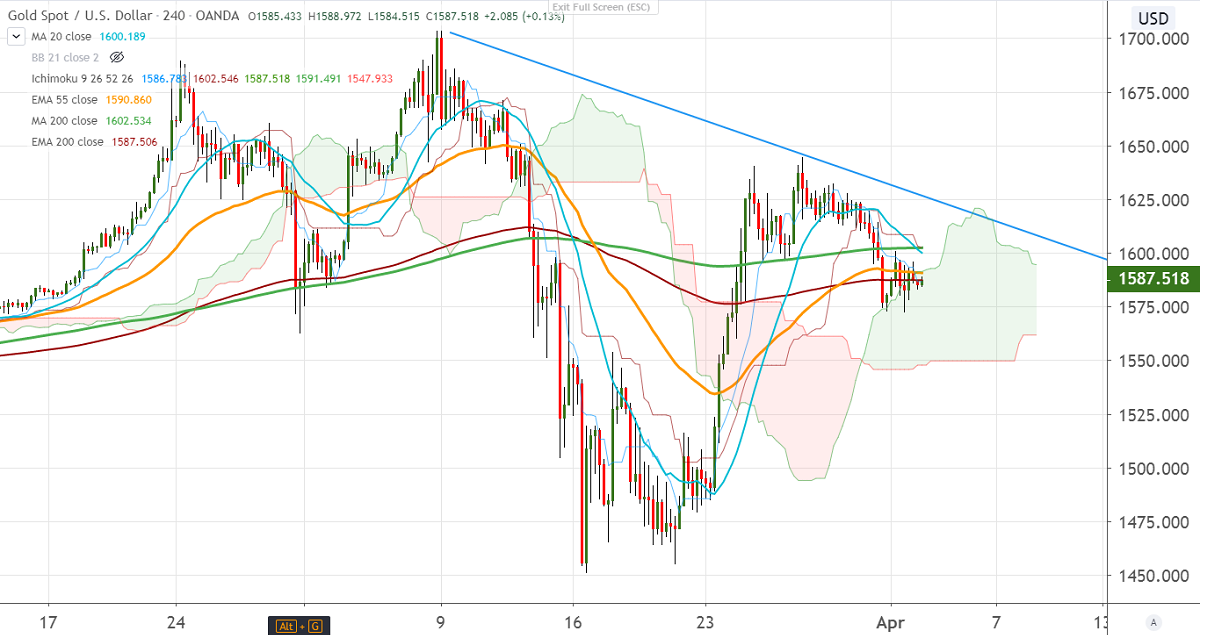 Gold is consolidating in a narrow range between $1600 and $1572 for the past two trading days. The yellow metal is struggling to trade above $1625 (trend line resistance) and $1640 level. The slight recovery in the US dollar index from a low of 98.27 is putting pressure on gold at higher levels.