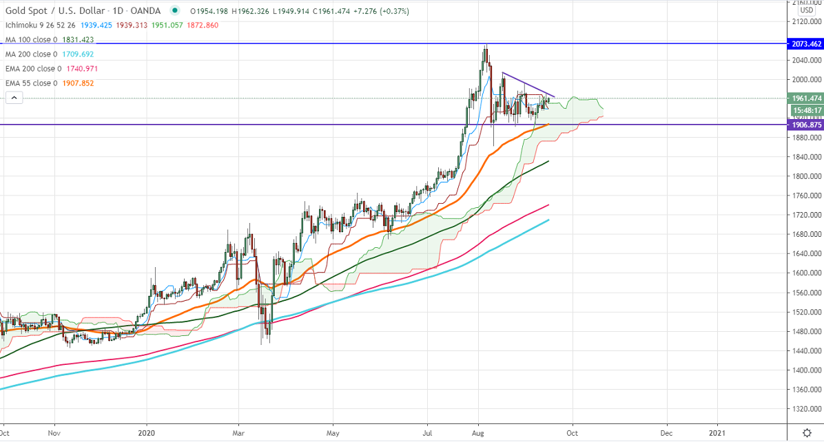 The gold is trading in a narrow range between $1992 and $1906 for the past two weeks. Markets eye the US fed monetary policy today for further direction. The Fed is planning to hold rates unchanged and investors look for economic projection. US dollar index is holding slightly above 93 levels, any violation above 94 will confirm bullish continuation. It hits an intraday high of $1961.50 and is currently trading around $1960.17.