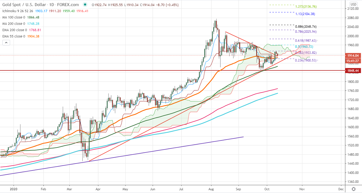 Gold is trading slightly weak on upbeat global sentiment. The US markets surged sharply especially, S&P500 surged more than 1.5% on hopes of fresh stimulus. DXY has shown a minor recovery till 93.24, violation past 92.50 confirms bearish continuation. Markets eye US CPI data for further direction. The yellow metal hits an intraday high of $1910 and is currently trading around $1912.50.