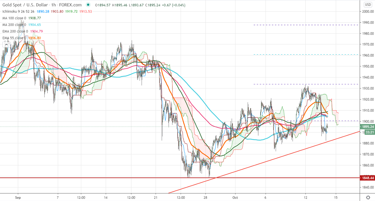 Gold has taken support near trend line support and shown a minor recovery. The strength in the US dollar is putting pressure on yellow metals at higher levels. The optimism of US fresh stimulus before the election got faded due to a lack of agreement between the Republic and democrats. The Consumer price index rose 0.2% MoM in Sep compared to a forecast of 0.2%. The headline inflation for the year increased by 1.4% vs 1.3% in August.
