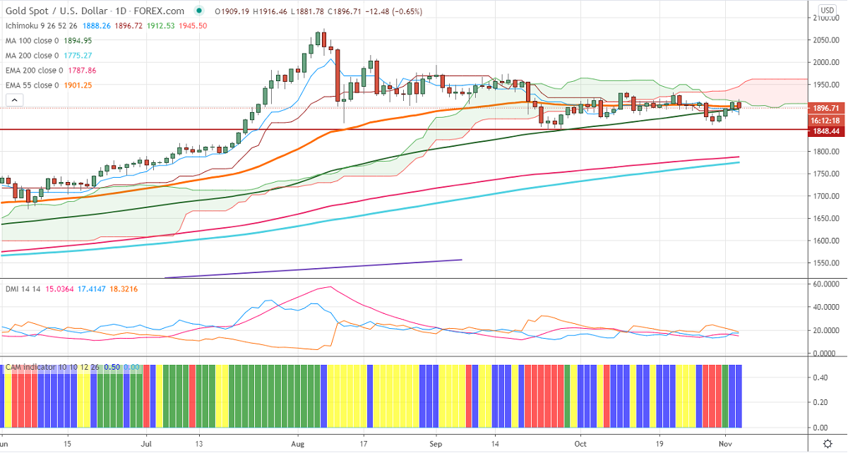 Gold has shown a minor recovery from a low of $1881. Markets eagerly waiting for the verdict of US elections for further direction. According to Fox News, Democrats are slightly ahead of Republic with 227-210. Trump wins Florida, Texas, and Ohio, while Arizona goes to Biden. US dollar index lost more than 50 pips from a high of 94.30.