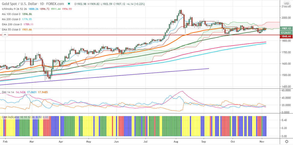 Gold is holding slightly above $1900 on the weak US dollar. The chance of Biden to win Presidential elections has increased after winning Wisconsin and Michigan. The Democrats lead 264 seats vs Republics 214. The number of private jobs added in Oct increased by 365K compared to the forecast of 650k, according to ADP. US dollar index lost more than 100 pips from a high of 94.30.