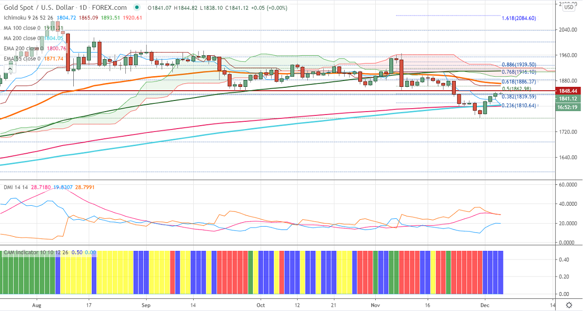 Gold continues to trade higher for the third consecutive days on a weak US dollar. US dollar index hits a fresh 32-month low on vaccine optimism and hopes of fresh stimulus. US economic data came mixed with US ISM services index came at six months low in November at 55.9 vs estimate of 55.90. While the number of people filed for unemployment benefits declined to 712000 compared to a forecast of 775K. The intraday trend is slightly bullish as long as support $1800 holds. Markets eye US Non-Farm payroll data for further direction.