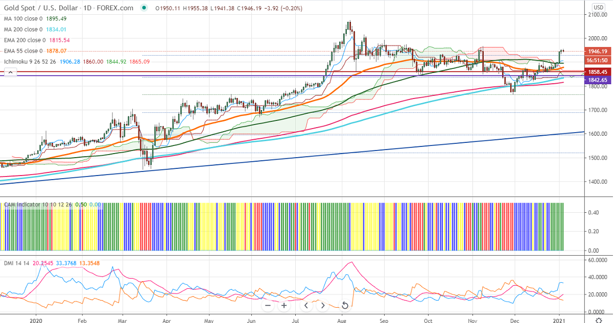 Gold has shown a minor dip after hitting a high of $1955. Markets eagerly awaiting Georgia election results for further direction. The lockdown in London due to the new muted coronavirus has increased demand for safe-haven assets like gold. It is currently trading around $1940.