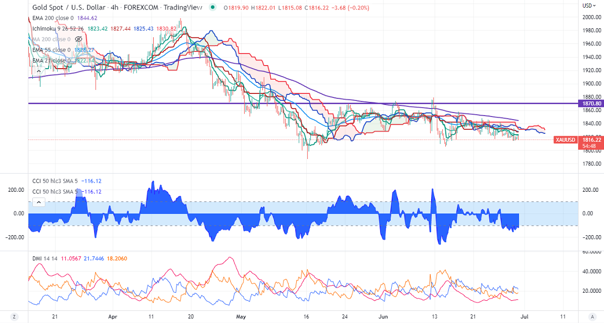 Gold price lost its shine and declined more than $15 from yesterday's high of $1833. US dollar index gained sharply despite weak US GDP data. It shrinks by 1.6% in the first quarter of 2022 compared to a forecast of -1.5%. Markets eye the US PCE price index and personal income for further direction. According to the CME Fed watch tool, the probability of a 75 bpbs rate hike in Jul dropped to 85.6% from 93.3% a week ago. It hits a low of $1818 and is currently trading around $1819.94.