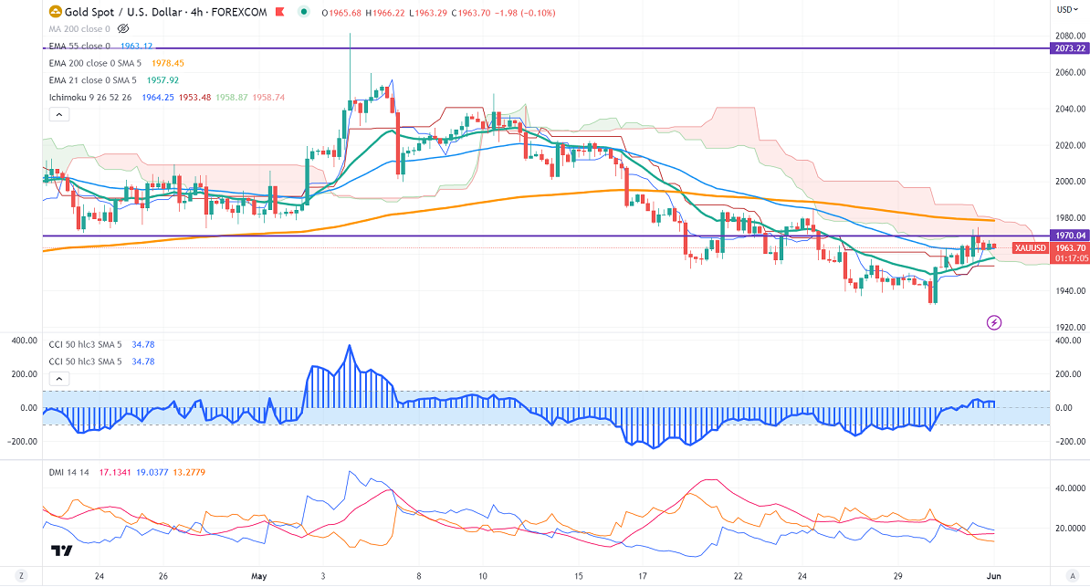 Gold prices pared some of their gains on upbeat market sentiment. The US House of Representatives voted yesterday to raise the debt ceiling limit to avoid default. It hit a high of $1974.82 yesterday and is currently trading around $1964.