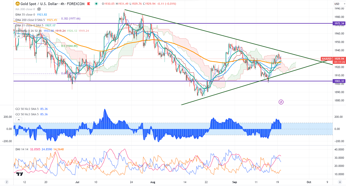 Gold showed a minor sell-off ahead of US Fed monetary policy. It hit a low of $1928.50 and is currently trading around $1930.32.