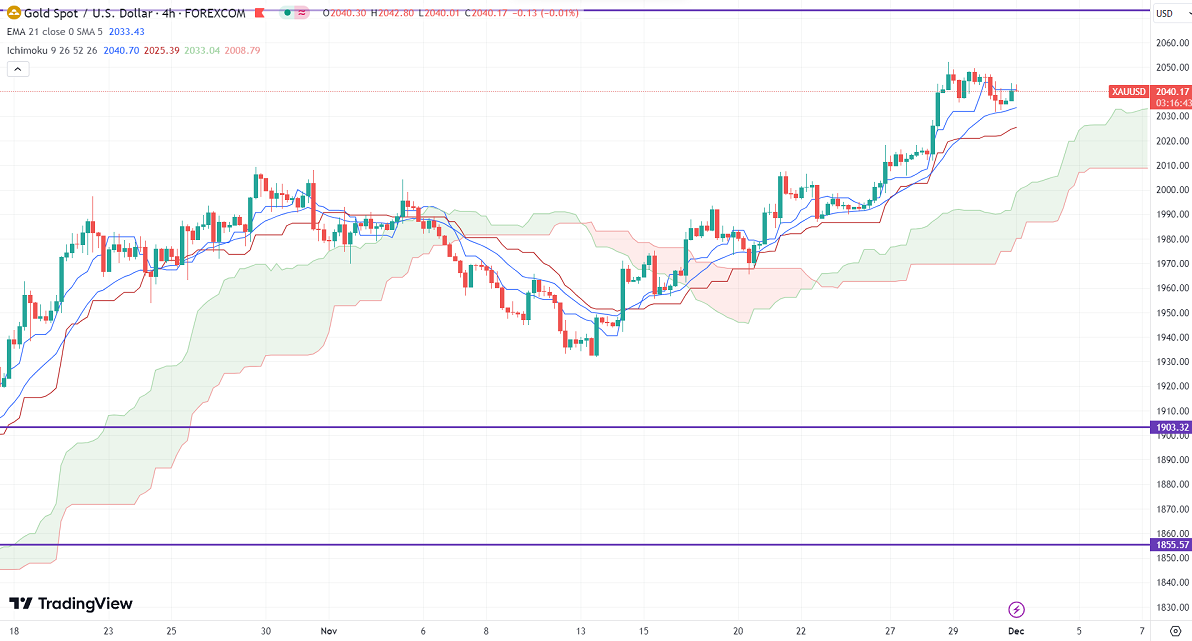Gold has consolidated in a narrow range between $2052.04 and $2031.79 for the past three days. It hit a high of $2043.48 yesterday and is currently trading around $2042.10.