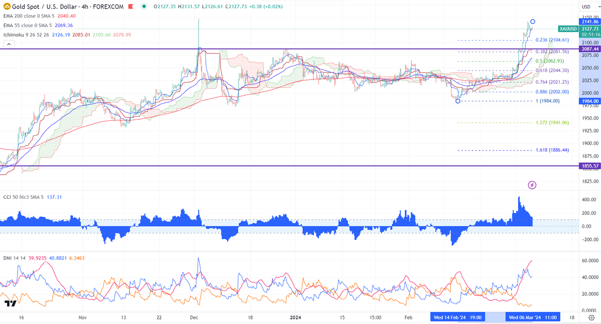 Gold trades higher on board-based US dollar selling. Markets eye Fed Chairman Powell's speech for further direction. The yellow metal hit a high of $2141.85 yesterday and is currently trading around $2127.