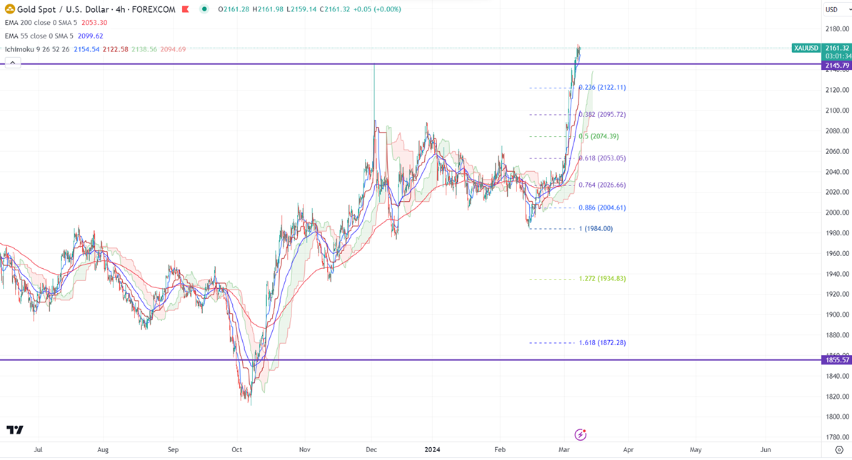 Gold hits all-time high ahead of US Non-farm payroll. Any dismal jobs data will push the yellow metal further higher. The ECB kept its rates unchanged and hinted at an early rate cut in June due to easing inflation. The yellow metal hit a high of $2164.77 yesterday and is currently trading around $2161.07.